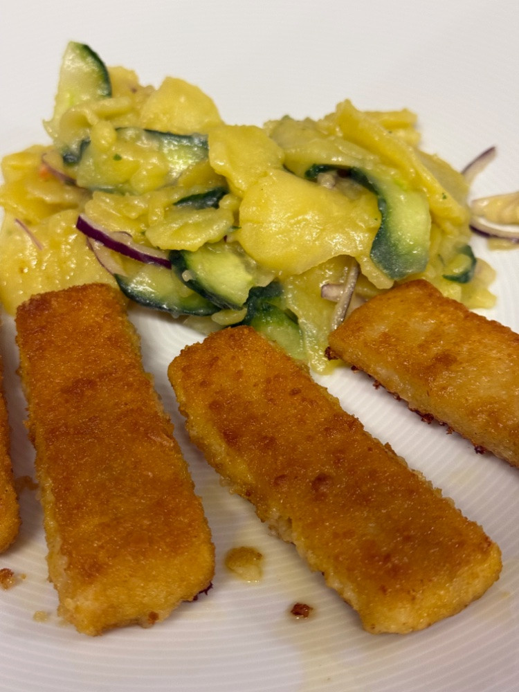 Gedünstet Lauch mit vegetarischen Frikadellen (TK) und Kräuterquark