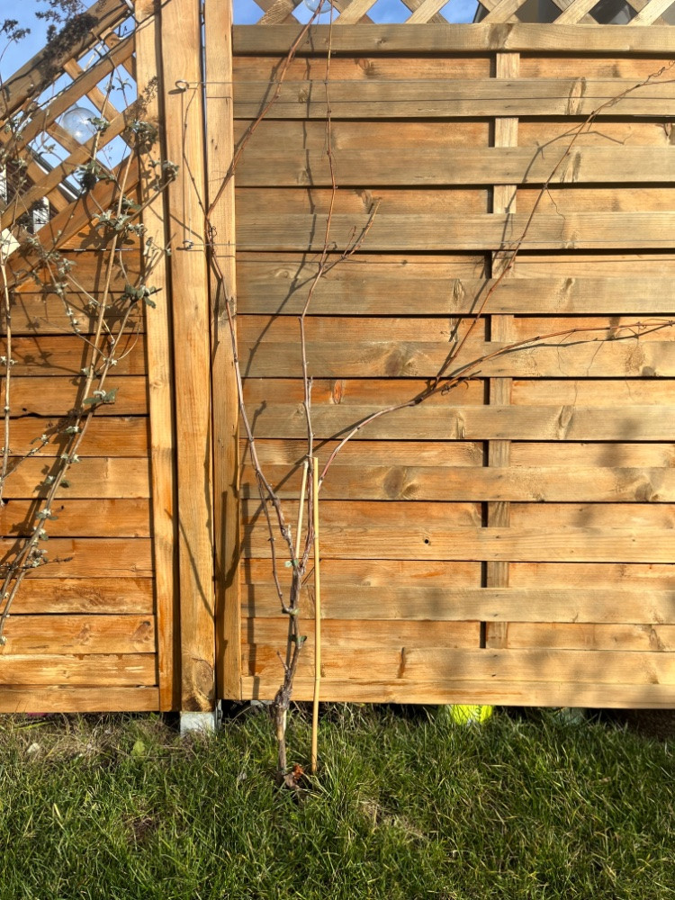 Etwas Bewuchsfreiheit um den Stamm würde gut tun. Auch endlich das Plastik um den Stamm aus der Anzucht entfernen. Und wenn das links daneben ein Schmetterlingsflieder ist, Rückschnitt auf maximal Kniehöhe, eher noch tiefer, verhindert vorzeitige Vergreisung.