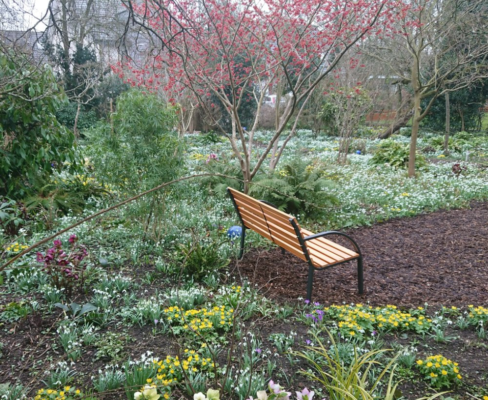 Zunächst eine solitäre Hamamelis, die seit 20 Jahren sehr breit und überhaupt nicht aufrecht wachsen will. Schwierig zu unterpflanzen, aber sehr leuchtend.