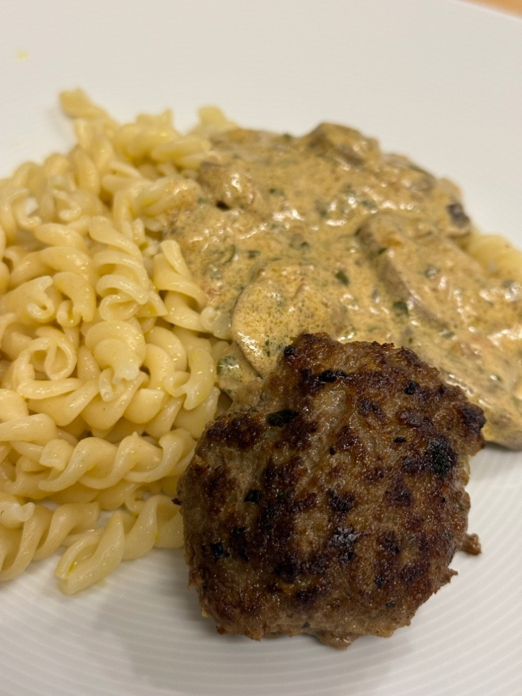 Bei uns gab es Fleischküchlein mit Champignons Schmand Soße.