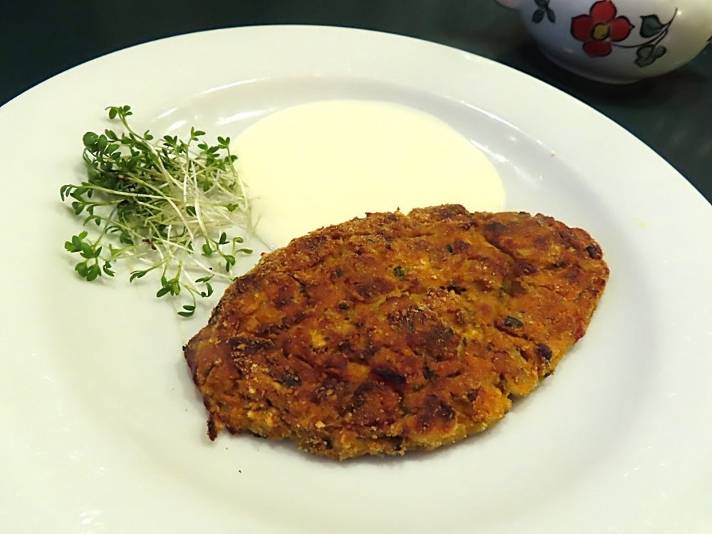 Weil ja unlängst hier von Gemüseschnitzl/Laberln die Rede war: Heute gab es sie hier, und sie waren wirklich gut. Genaues Rezept gibt es nicht, weil ich sie meist mit vorhandenen Gemüsevorräten bzw. -resten mache, heute erstmals auch mit Süßkartoffeln, was sich als Bereicherung erwiesen hat. Ungefähr so, aber man kann auch z.B. geschälte Brokkolistiele, Kohlrabi etc. verwenden: