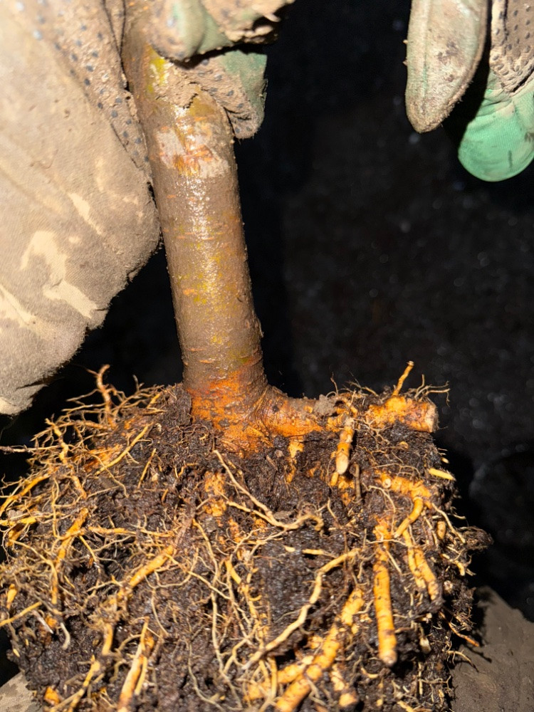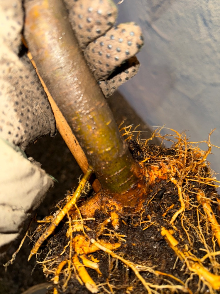 Wurzel Ansatz war doch etwas besser als erwartet habe jetzt im oberen Bereich die drehwurzeln entfernt und Seiten wurzeln beschnitten da sie abgeknickt waren, jetzt sollte da ja neues seitenwachstum einsetzen