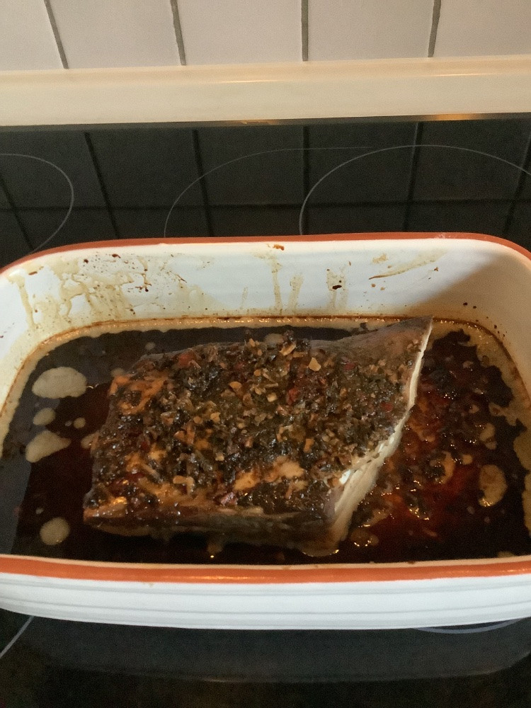mit 50 g Ingwer, 3 Knobi, 7 EL Sojasoße und 3 EL Honig, 1 Chilischote und etwas Espelette, 1/2 Bund glatte Petersilie, über Nacht marinieren. Alles mischen und das Fleisch damit eincremen.