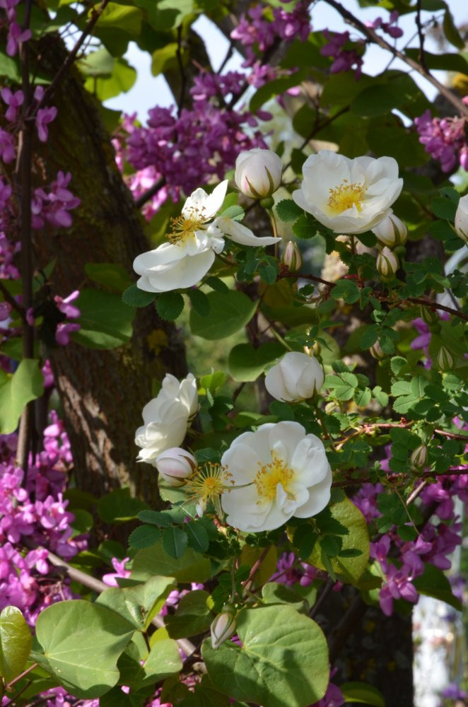 Ich lege an die Rose an, mit R. pimpinellifolia 'Double Cream'. Im Hintergrund Blüten vom Judasbaum.
