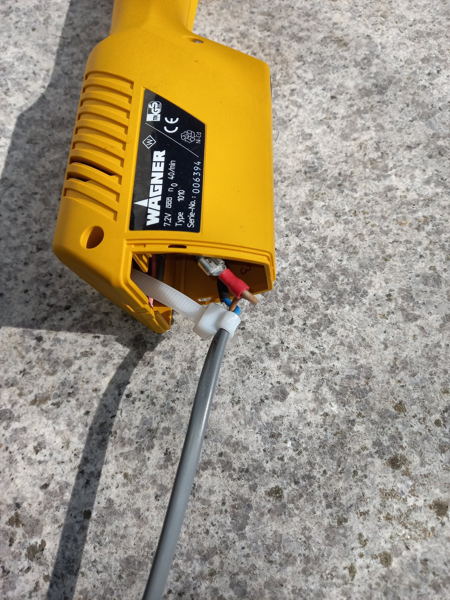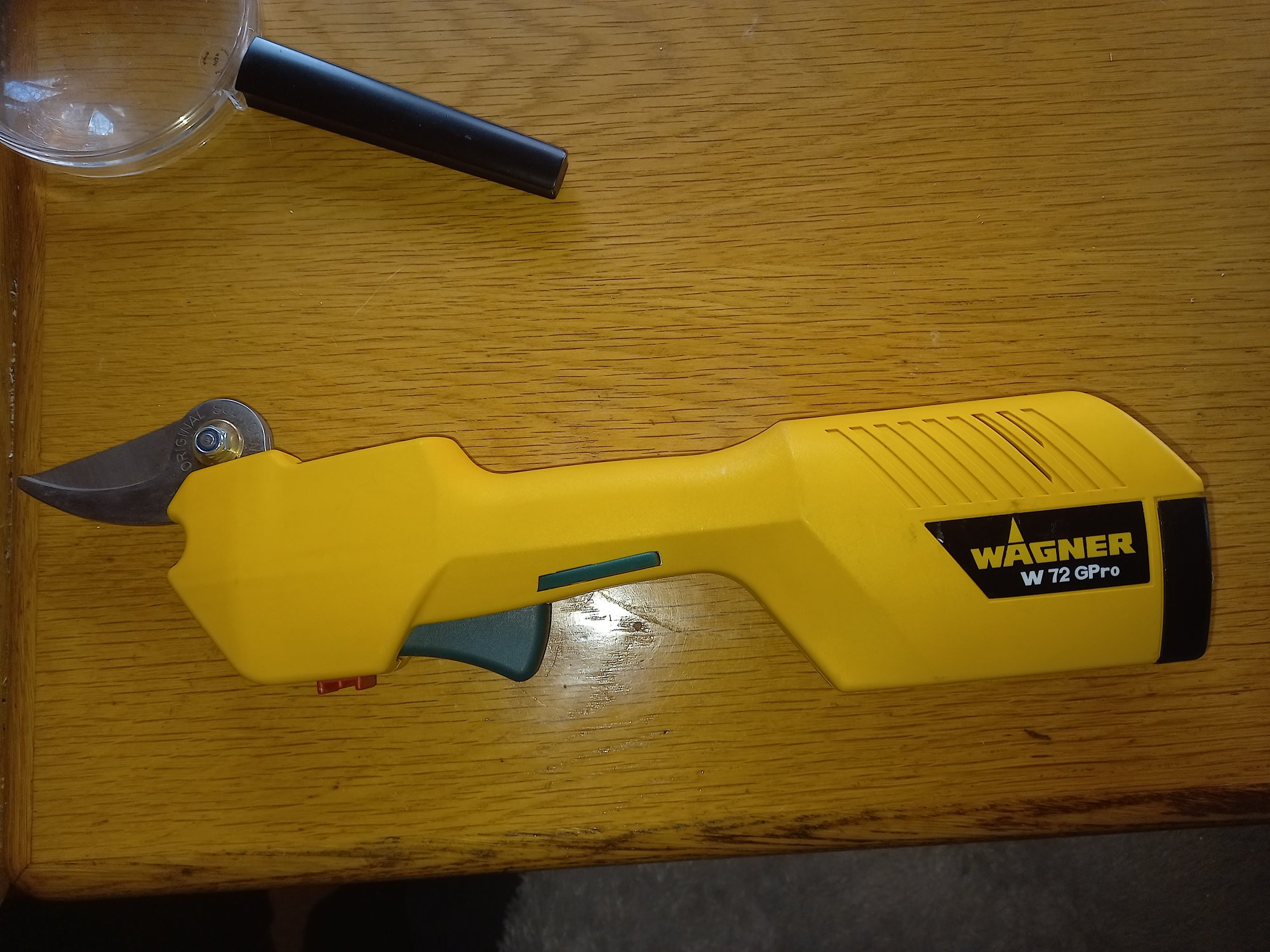 Habe eine alte Akku Elektroschere vom Flohmarkt geholt. Von der deutschen Firma Wagner Group (W72 GPro). Sie hat einen 2 Ah 7,2V NiCd Akku. Geladen über einen Klinkenstecker. Wurde nie benutzt. Ich weiß auch warum. Das Ladegerät war kaputt. Daher würde das Ding über Jahre wieder beim Händler zurückgeben.