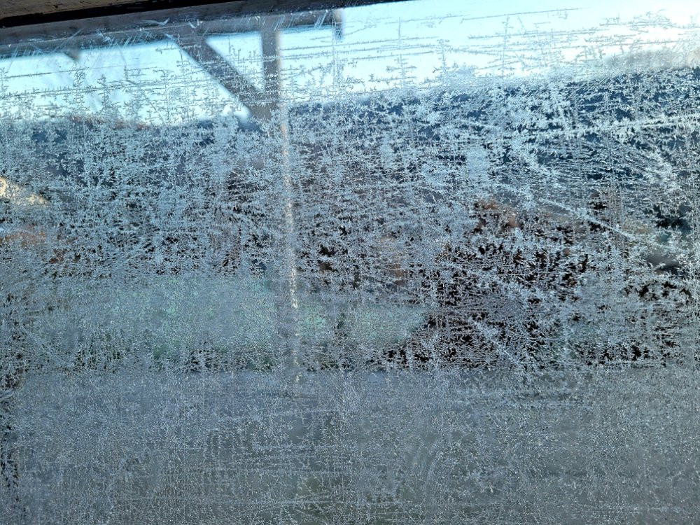 -3,3 Grad, die Sonne kommt erst noch hoch, wieder alles weiß vom Raureif
