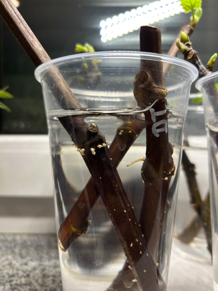 Die letzten werden die ersten sein! Bei den anderen Stecklingen ist überall schon ein Austrieb und Kallusgewebe zu erkennen. Bei dem Domenico Tauro Steckling war kein Austrieb und wenig Kallus am Steckling und trotzdem hat er als erstes Wurzeln gebildet. Ich bewurzle zuerst im Wasser und dann wenn die ersten Wurzeln da sind, kommen sie in Seramis. Ich finde Seramis unkompliziert und habe kein Problem mit Trauermücken. Im März/April kommen sie dann in luftige Erde. Ich bevorzuge auch ausgereiftes Holz zum bewurzeln. Am besten so 1cm dick. Grüne Kopfstecklinge kannst aber auch gut bei warmen Wetter in die Erde stecken. Funktioniert auch sehr gut. Auf dem Bild sieht man ein Steckling der halb ausgereift ist und der treibt immer nach oben. Solches Material will ich eigentlich nicht, aber sowas bekommst auch zugeschickt!
