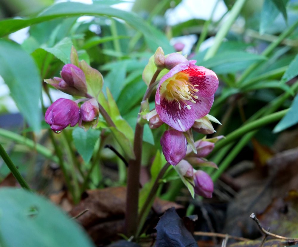 Hier zeigen die meisten Lenzrosen ihre Blütenstände, fast alle noch knospig. Diese hier ist am weitesten... Im Winter 2023/2024 gepflanzt, hat sie sich schön entwickelt: