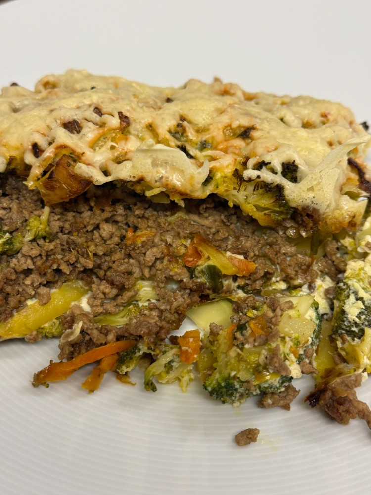 Gemüseauflauf mit Hackfleisch in der Mitte. Salat dazu.