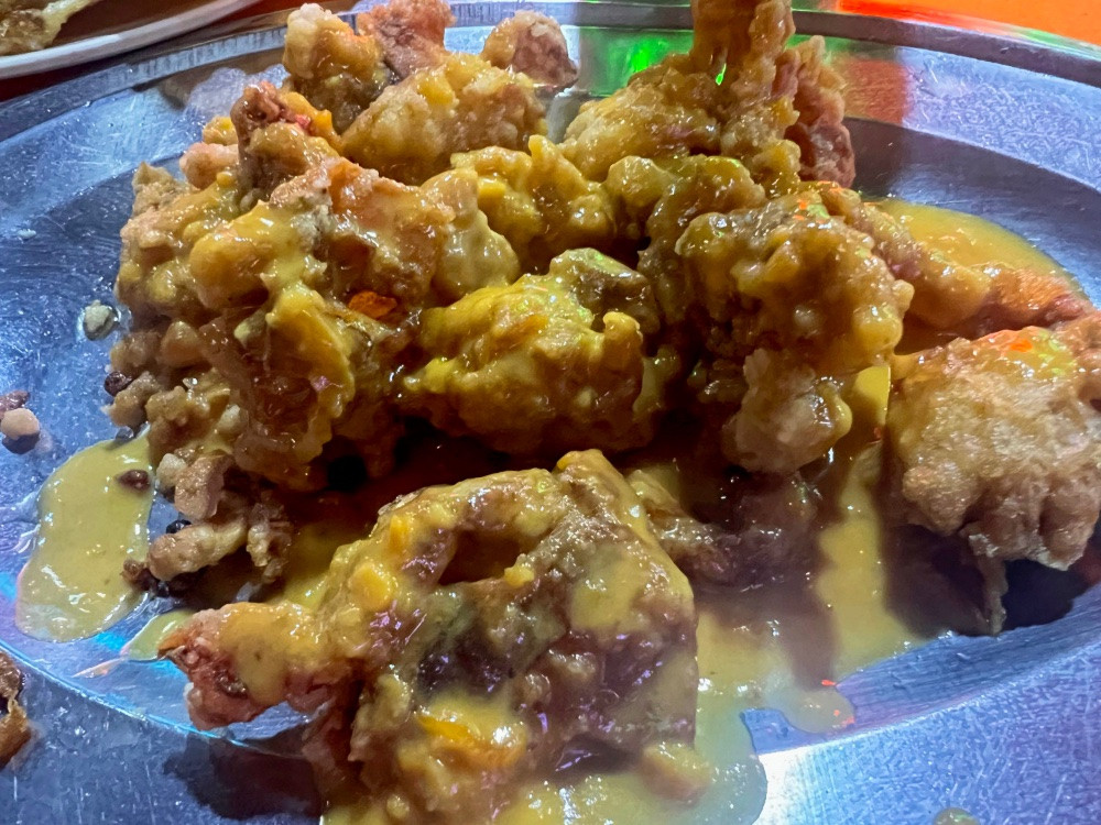 Signature Dish sind die Austern, krosser Austernpfannkuchen 25 cm Durchmesser mit ca. 20 Austern ... nun ja, lecker, aber ein wenig gewöhnungsbedürftig ... danach Softshell-Crab mit Eigelb-Sauce, lecker, knusprig und gut. Aber alles in allem zu viel, zu mächtig. - Wir verdauen gerade mit ein paar Gläsern eines einfachen Chardonnay aus Australien.
