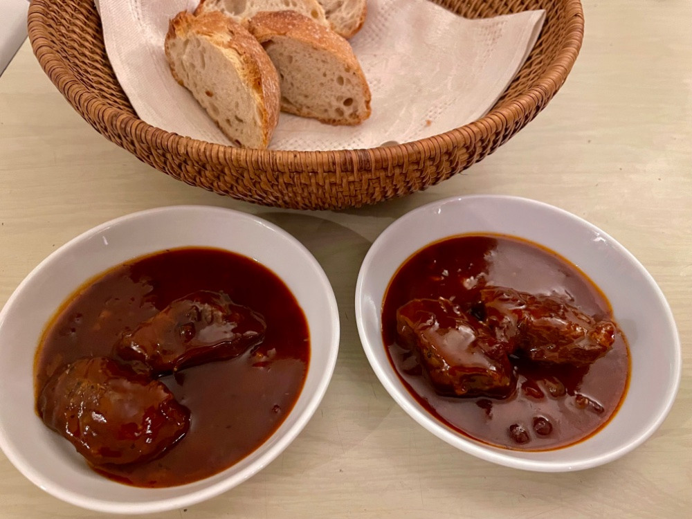 Signature Dish sind die Austern, krosser Austernpfannkuchen 25 cm Durchmesser mit ca. 20 Austern ... nun ja, lecker, aber ein wenig gewöhnungsbedürftig ... danach Softshell-Crab mit Eigelb-Sauce, lecker, knusprig und gut. Aber alles in allem zu viel, zu mächtig. - Wir verdauen gerade mit ein paar Gläsern eines einfachen Chardonnay aus Australien.
