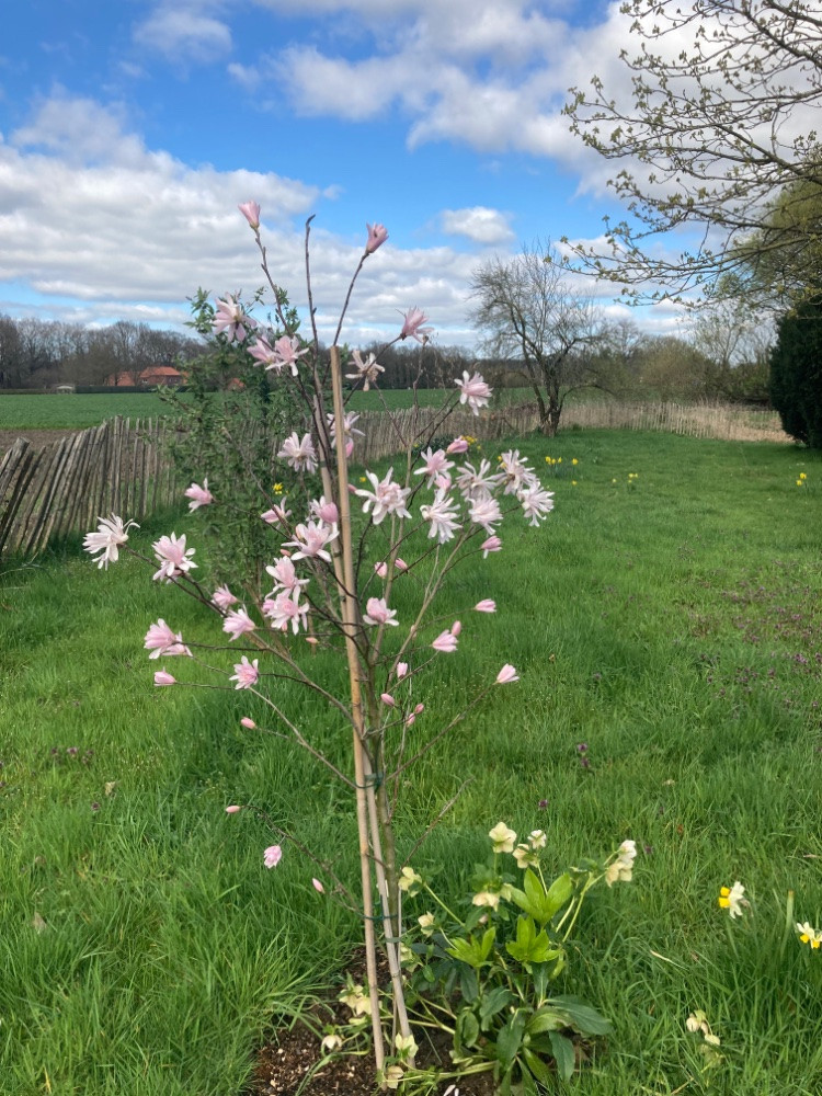 Rechts sieht es nach Magnolie aus. Lege an mit junger Sternmagnolie. Vielleicht kommen wir auf Wiese, auch ein schönes Thema.