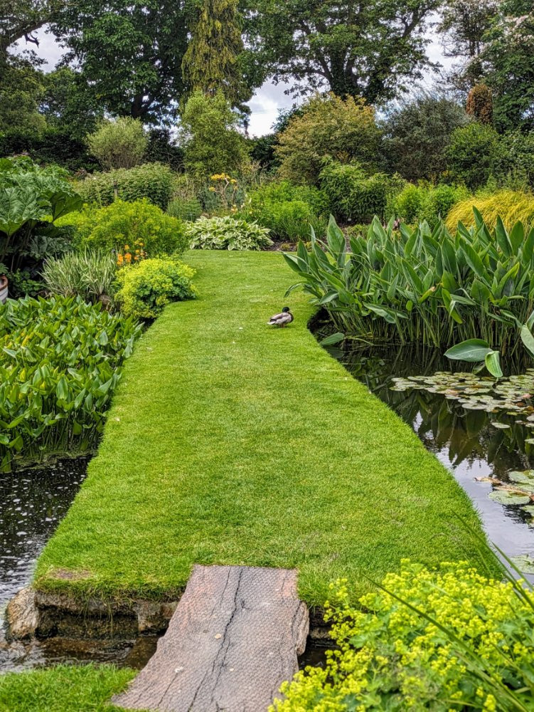 Beth Chattos Garten mit Ente, Rasen und Wasser
