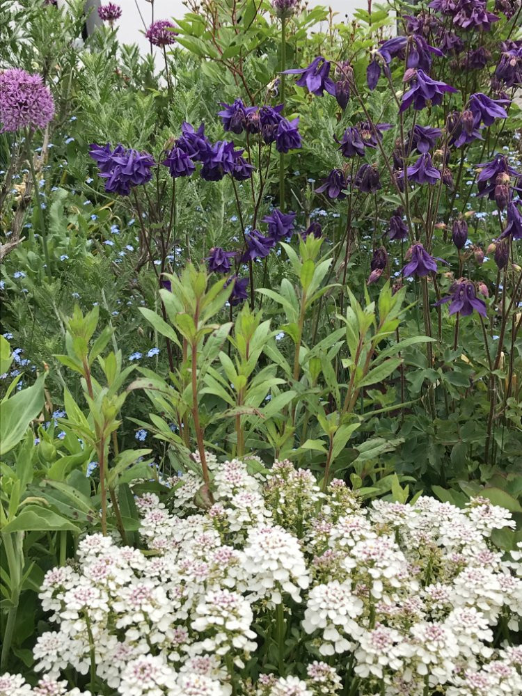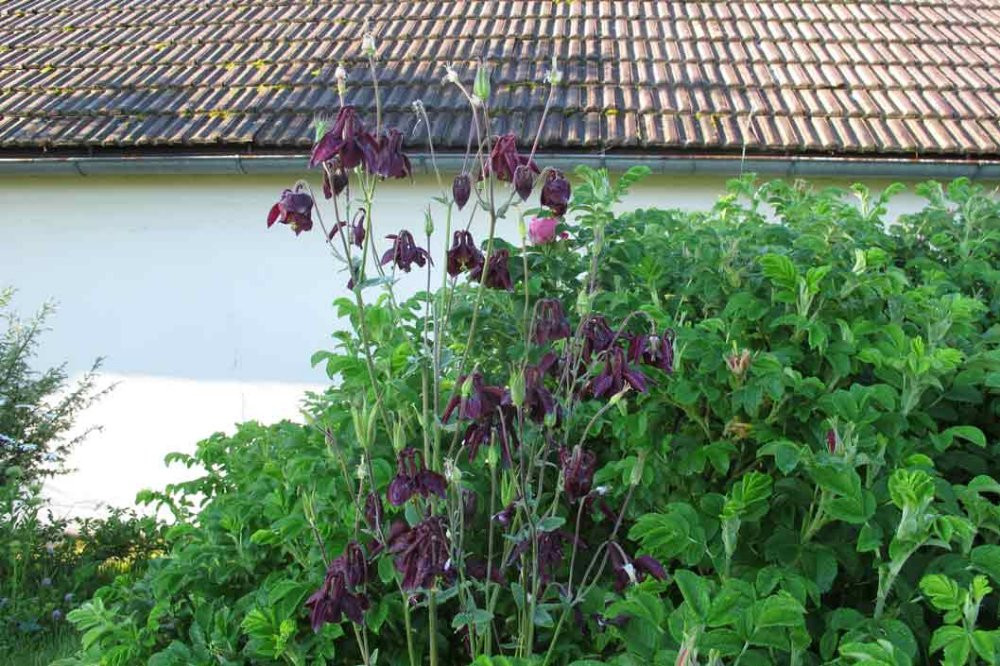 Aquilegia atrata wollte am ursprünglich vorgesehenen Platz nicht wachsen und dürfte mit dem Kompost zur Rugosahecke gekommen sein. Links ein Wacholder, sonst leider nix. Grade wieder mal Glück gehabt