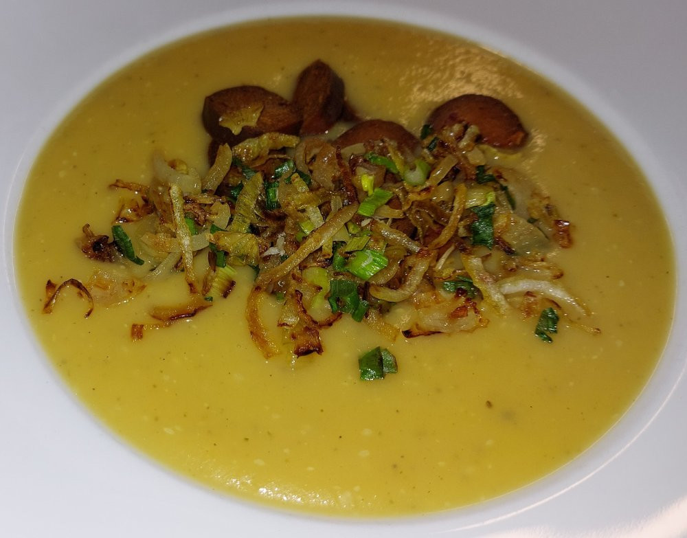Steckrübensuppe mit veganer "Wurst" und braunen Zwiebeln
