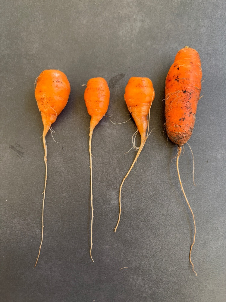 Heute habe ich zum Beispiel wieder einige Karotten geerntet, die zwar eine lange Wurzel haben, aber diese Wurzel nur oben verdickt ist. Warum?