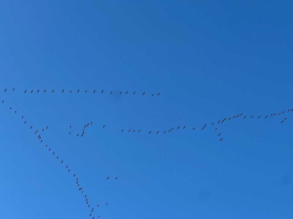 Gegen Abend, als die Sonne schon tiefer stand, wurden die Kraniche sozusagen von unten angeleuchtet. Leider kein Foto machen können....