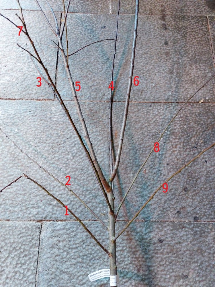 Ok, aber Ast 5 würdest du auch einkürzen und die Verzweigung oben damit komplett entfernen, oder? Eigentlich ist der Ast sowieso recht schief und ich würde evtl. lieber Nummer 6 als Stammverlängerung nehmen, der ist zumindest etwas gerader, sieht man auf dem Foto nicht so gut bei der 5.