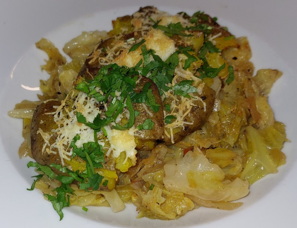 Gesmashte Kartoffeln mit Ziegenkäse auf geschmortem Wirsing