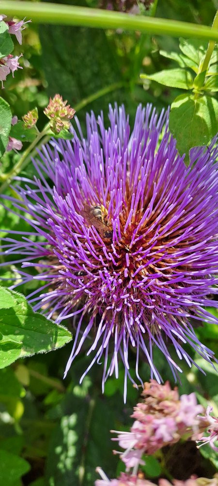 Ich lege an die Biene an. Blüte einer Kardone (Spanische Artischocke).