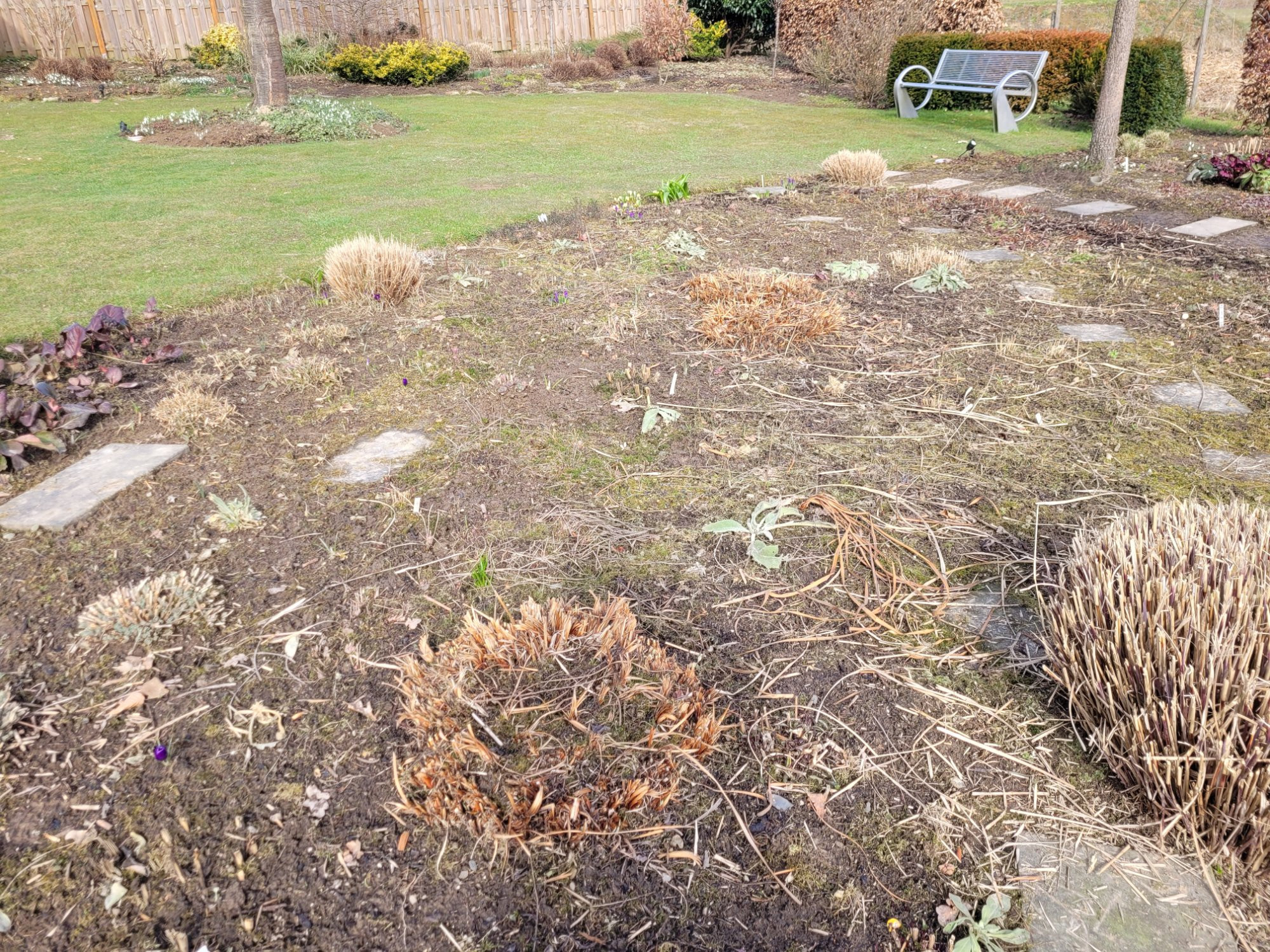 Ich würde jetzt vermutlich mit der ganzen Kraft der Wut/Verzweiflung im Bauch die Bank etwas nach vorne rücken und versuchen, die Hecke ebenfalls zu versetzen, falls dahinter aktuell nicht viel Platz ist, und dann selbst schnellwachsende, mittelgroße Weiden dahintersetzen.