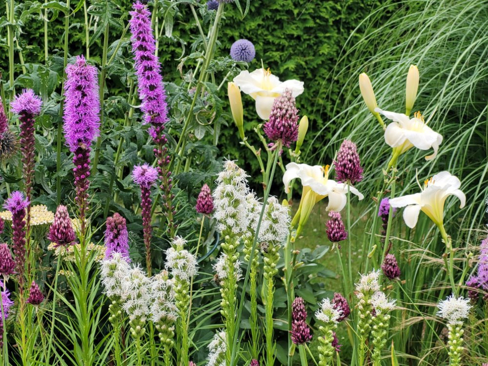 Für die Ränder Anaphalis triplinervis 'Silberregen' und Stachys 'Hummelo', auch 'Rosea'.... Hatten wir schon Liatris spicata