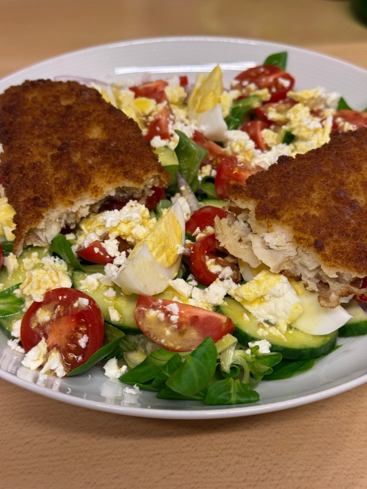 Gestern geräucherte Heilbutt mit Pellkartoffeln. Heute gab es großen Salat mit panierte Seelachs mit Schafskäse und Senf-Zitrone Dressing.