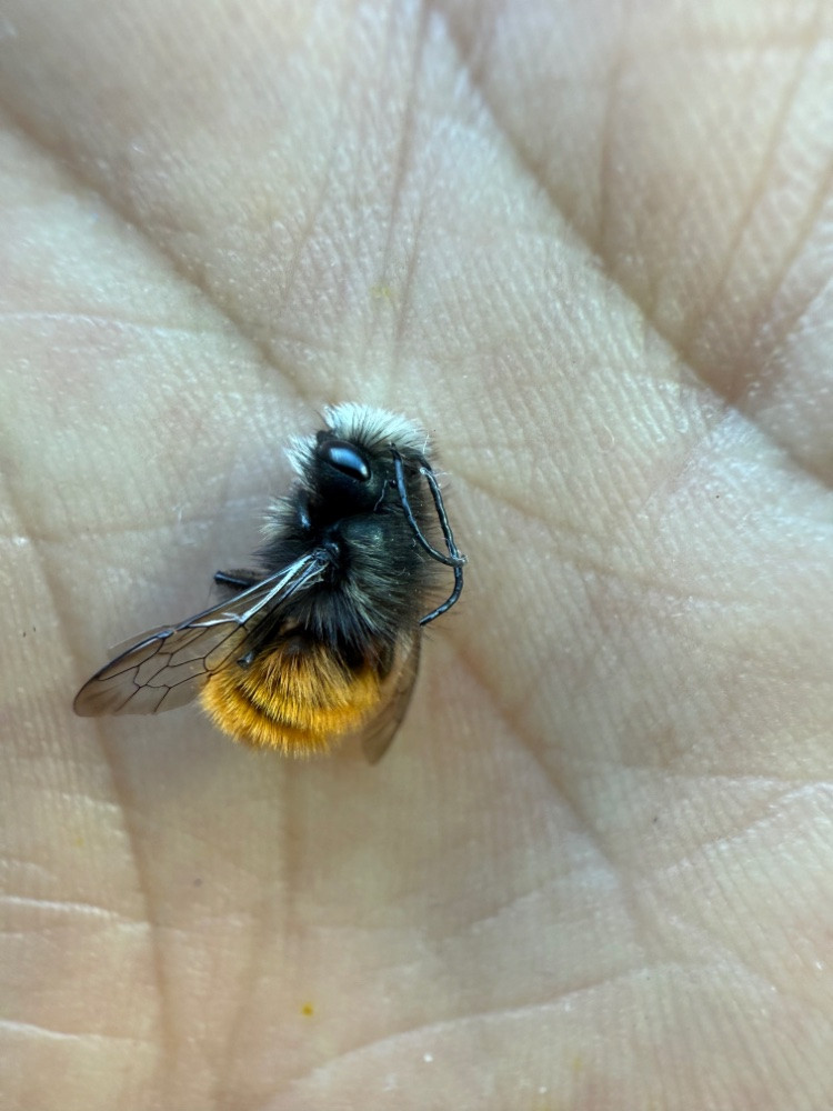 Jedenfalls ist diese Mauer Biene schon unterwegs gewesen vllt etwas zu früh, denn lebendig sieht sie nicht mehr aus und bei soviel Behaarung hatte sie wohl kein langes leben als erwachsene Biene, schade