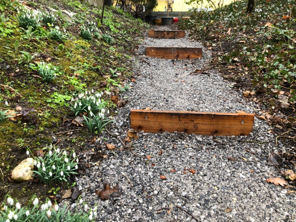 das sind jetzt einfach die ganz normalen was ich aber richtig rührend fand: bin gerade an dieser Wohnanlage dran, verbessernd/ planend/ modernisierend mit Bestand, da haben die Gärtner einen Weg geebnet, gegen die Erosion einfache Stufen gebaut und etwas gemischten, bindigen Schotter draufgegeben und ziemlich wahrscheinlich auch mit der Rüttelplatte kurz verdichtet, aber die Schneeglöckchen sind einfach ausgetrieben, sehr tapfer
