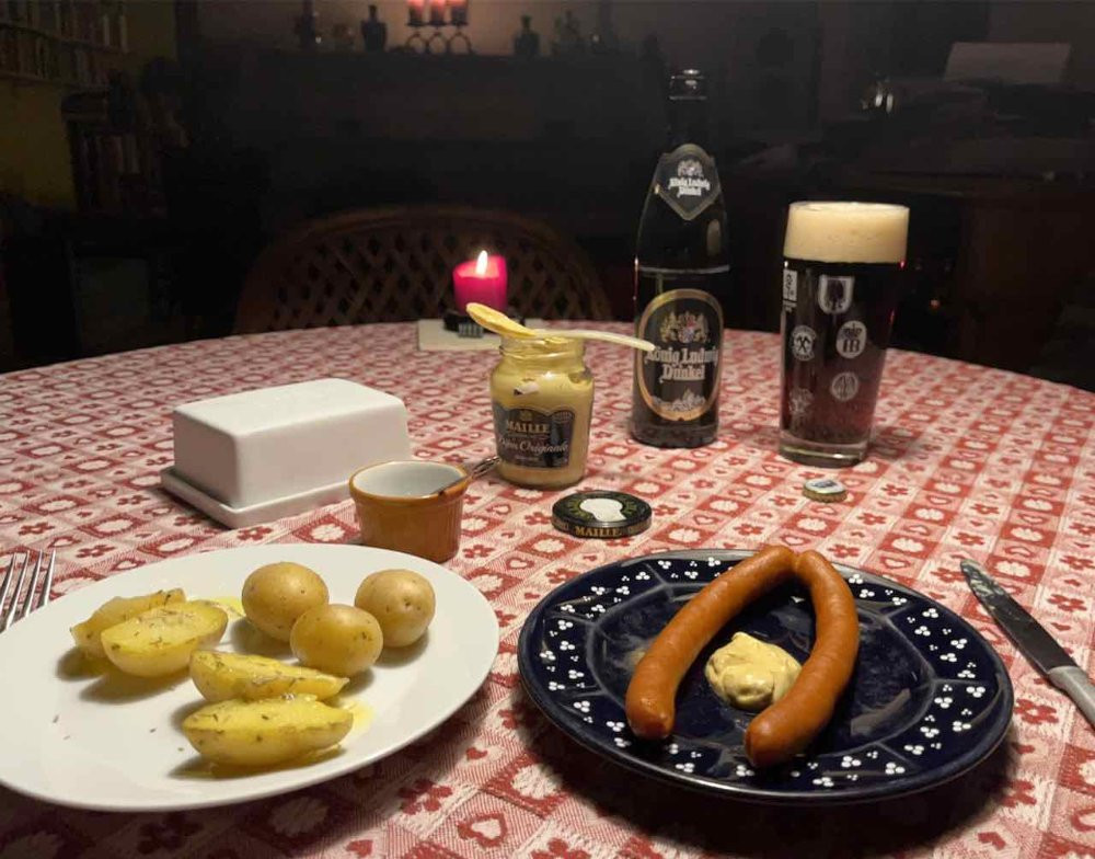 Ganz einfach: Hauptgerichte Debreziner gesotten und mit Dijon-Senf sowie Rosmarinkartoffeln gedämpft zum König-Ludwig-Dunkel