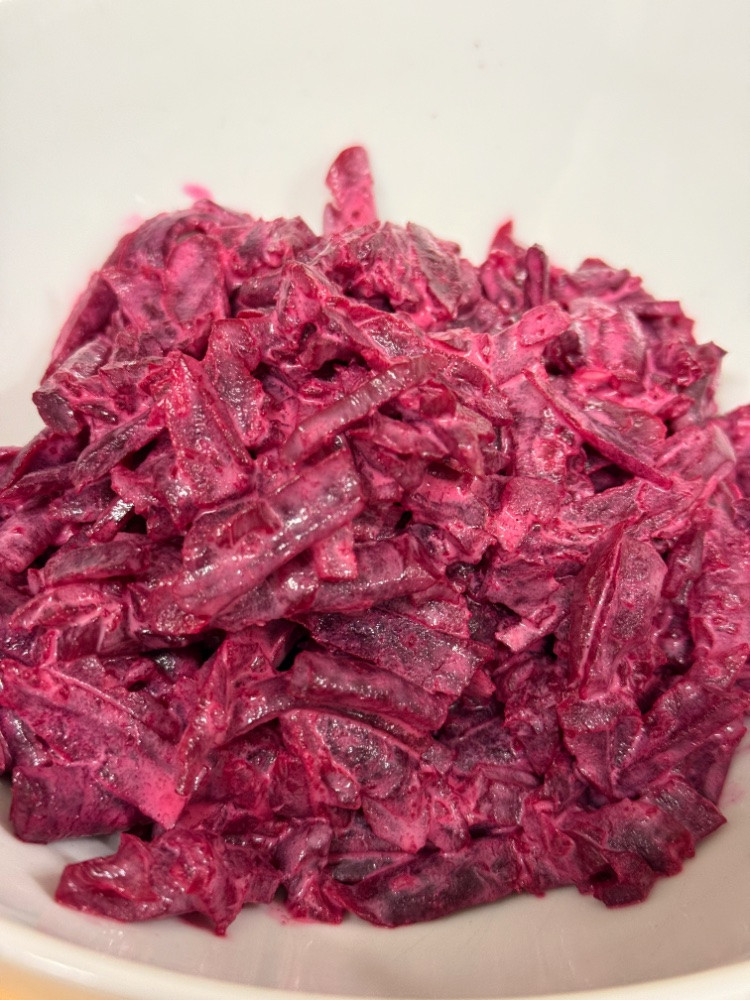 Bei uns gab es heute russischen Rote Beete Salat und Selbstgekauften Spinatspätzle und Champions mit ein Schlückchen Sahne. Sieht wie die Pampe aus