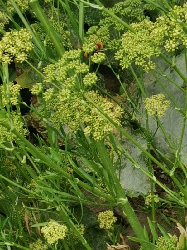 Hier mal noch ein Bild der Blüte. Die asiatische Hornisse ist nicht zufällig drauf, Doldenblütler sind ja Insektenmagneten, die war an den gut besuchten Blütenständen gerne jagen.