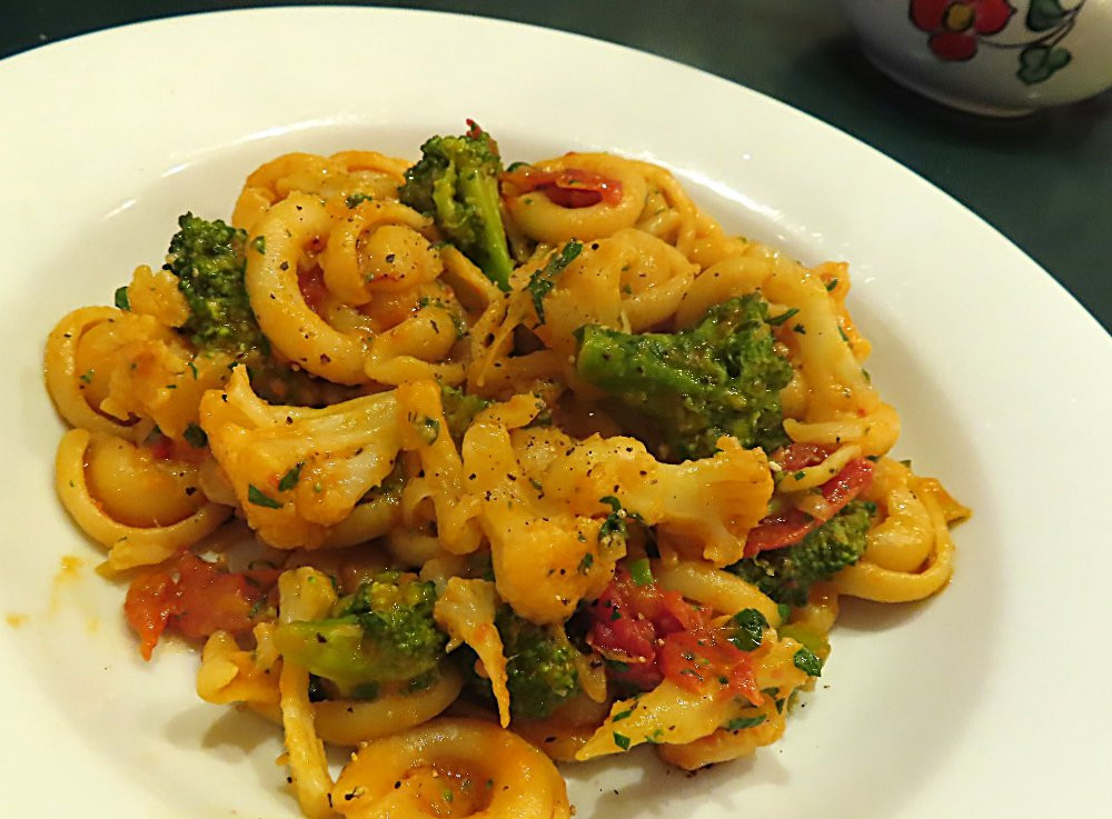 Hier gab es am Montag Fortsetzungsessen, nämlich aus dem Restfleisch vom Sonntag Tiroler Gröstl mit Chinakohl- und rote Rübensalat, und gestern, nach so viel Bodenständigem, Pasta mit Karfiol, Brokkoli, Tomaten und Parmesan. Und nachdem sich im TK eine Packung Kozice (die kleinen Shrimps aus der Adria) gefunden hat und noch zwei Zucchine da waren, wieder mal Tagliatelle con scampi e zuchine aus Harry's Bar Kochbuch. Original sollten es die dünneren Taglioni sein, aber das Foto im Buch zeigt auch nicht Scampi, sondern Kozice - es war also nicht ganz original, aber sehr, sehr gut :D Das Rezept geht auch mit zarten Blättern der cardi - für die Beneidenswerten, die welche im Garten haben.