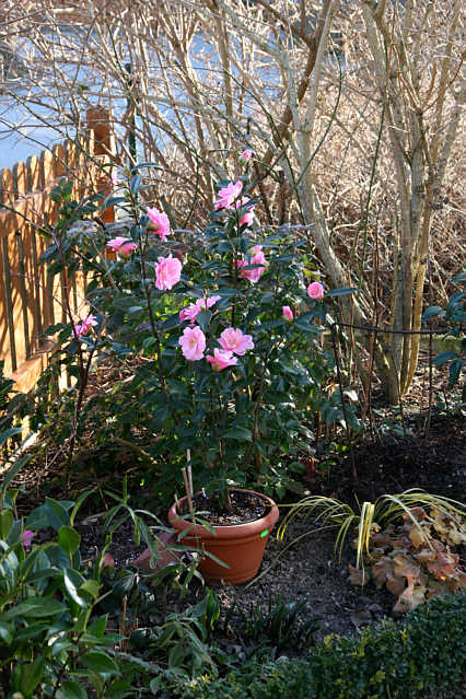 Meine Kamelien genossen heute wieder ihren Freiluftaufenthalt. Es war wieder ein sehr schöner sonniger Tag. Im Schatten war es aber  empfindlich kühler. Abends mussten sie in die Garage wieder zurück, da wieder Frost für die Nacht angesagt wurde. Gestern hatten wir schon wieder minus 7 Grad. Aus diesem Grund mussten einige frostempfindliche Pflanzen den Kamelien in die Garage wieder folgen. Das schöne Spielchen, die Pflanzen am Tage raus und Nachts wieder rein tragen, wird wohl noch eine Weile dauern.Fuliro