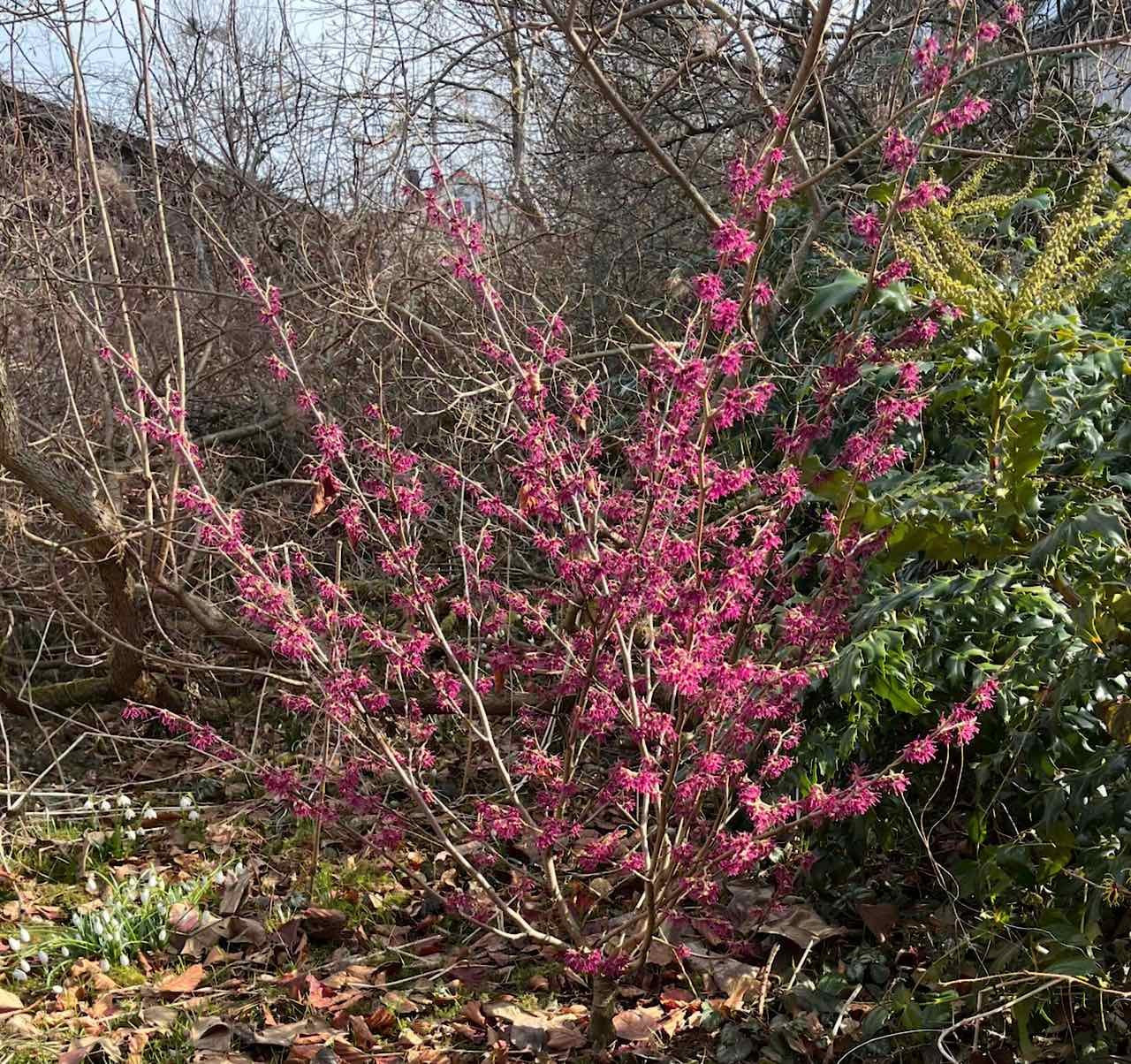 'Hamamelis 'Amethyst' ist in Hochform. Links Gaalanthus und Leucojum, rechts Mahonia.