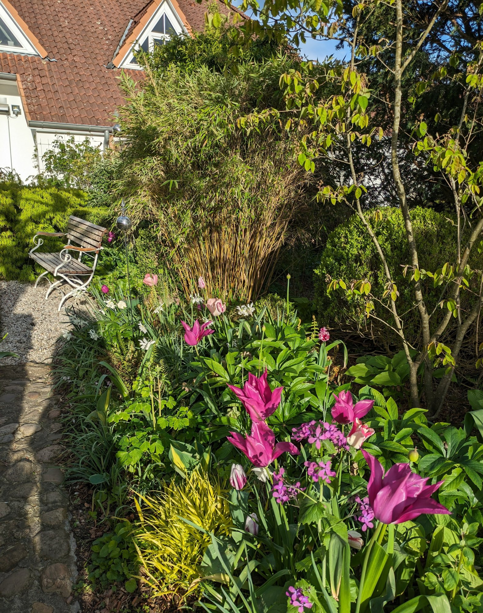 Weil keiner anlegt, biete ich noch Iris mit Vergissmeinnicht, Hakonechloa und einer Bank.