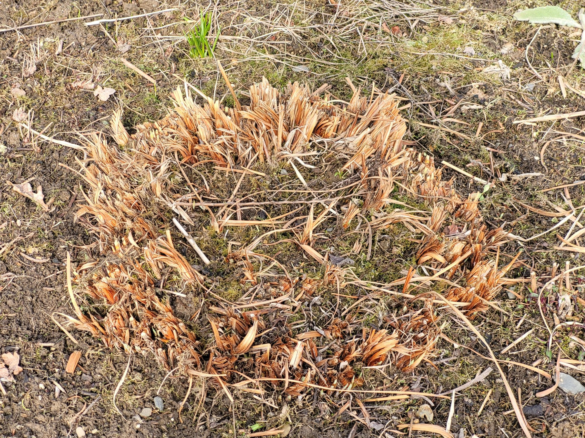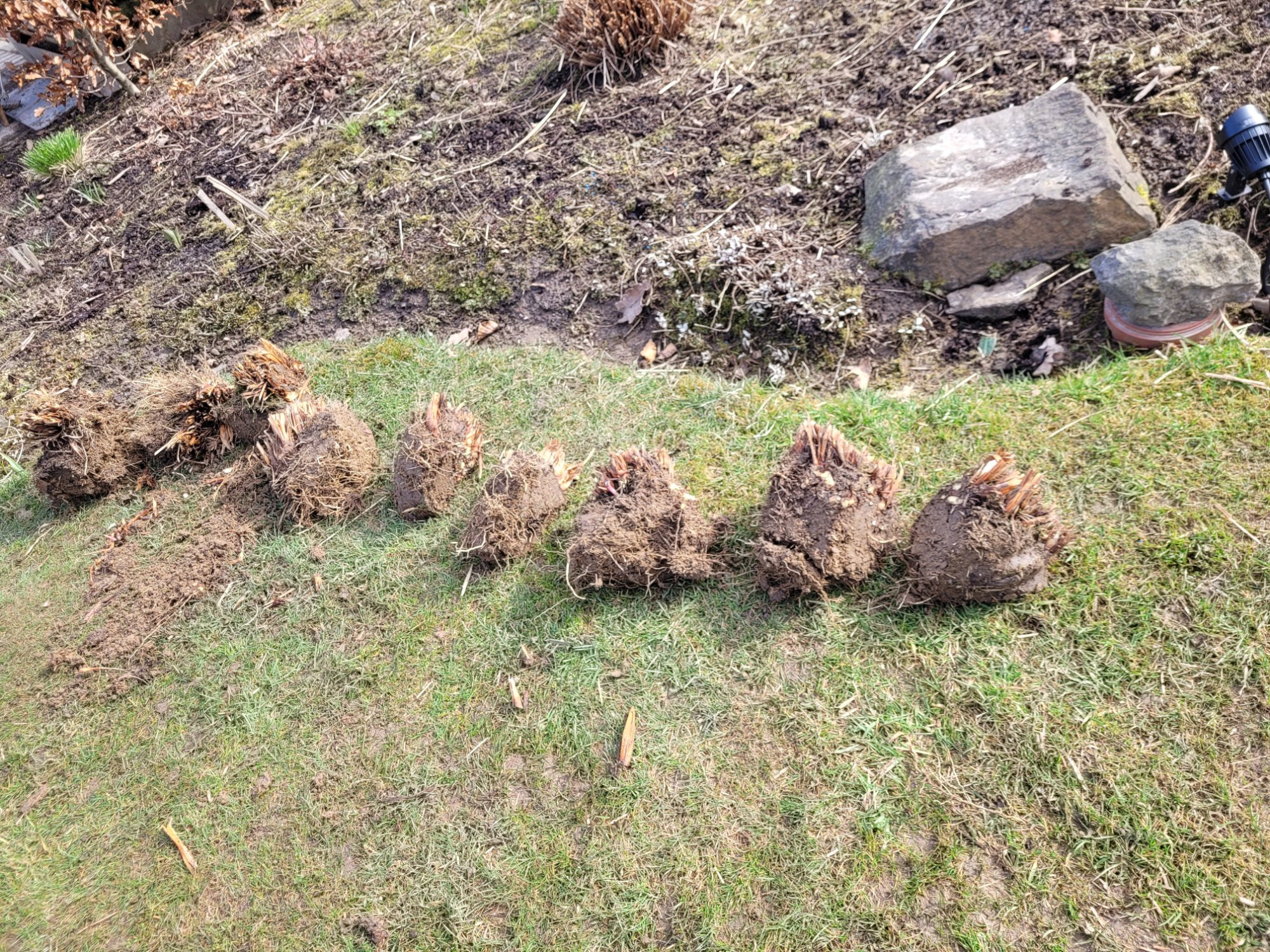 Der äußere Kranz der Horste trieb bereits deutlich aus, aber es waren auch im Wurzelbereich deutliche Fraßspuren von Mäusen erkennbar.