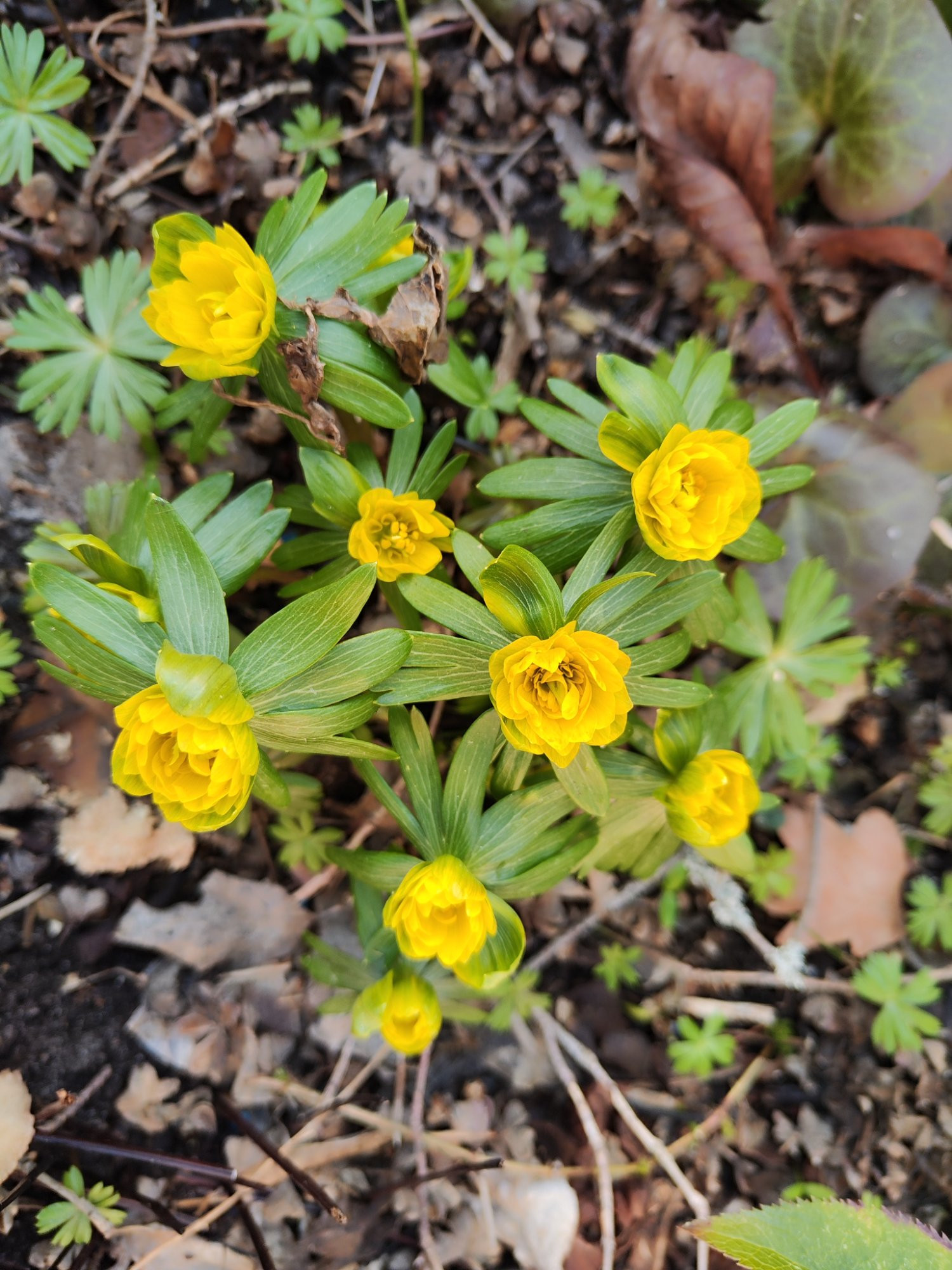 Wie oile schreibt, blüht diese Hybride später und lässt sich recht einfach an den dunklen Hochblättern, die die gelbe Knospe einschließen, von Eranthis hyemalis unterscheiden.