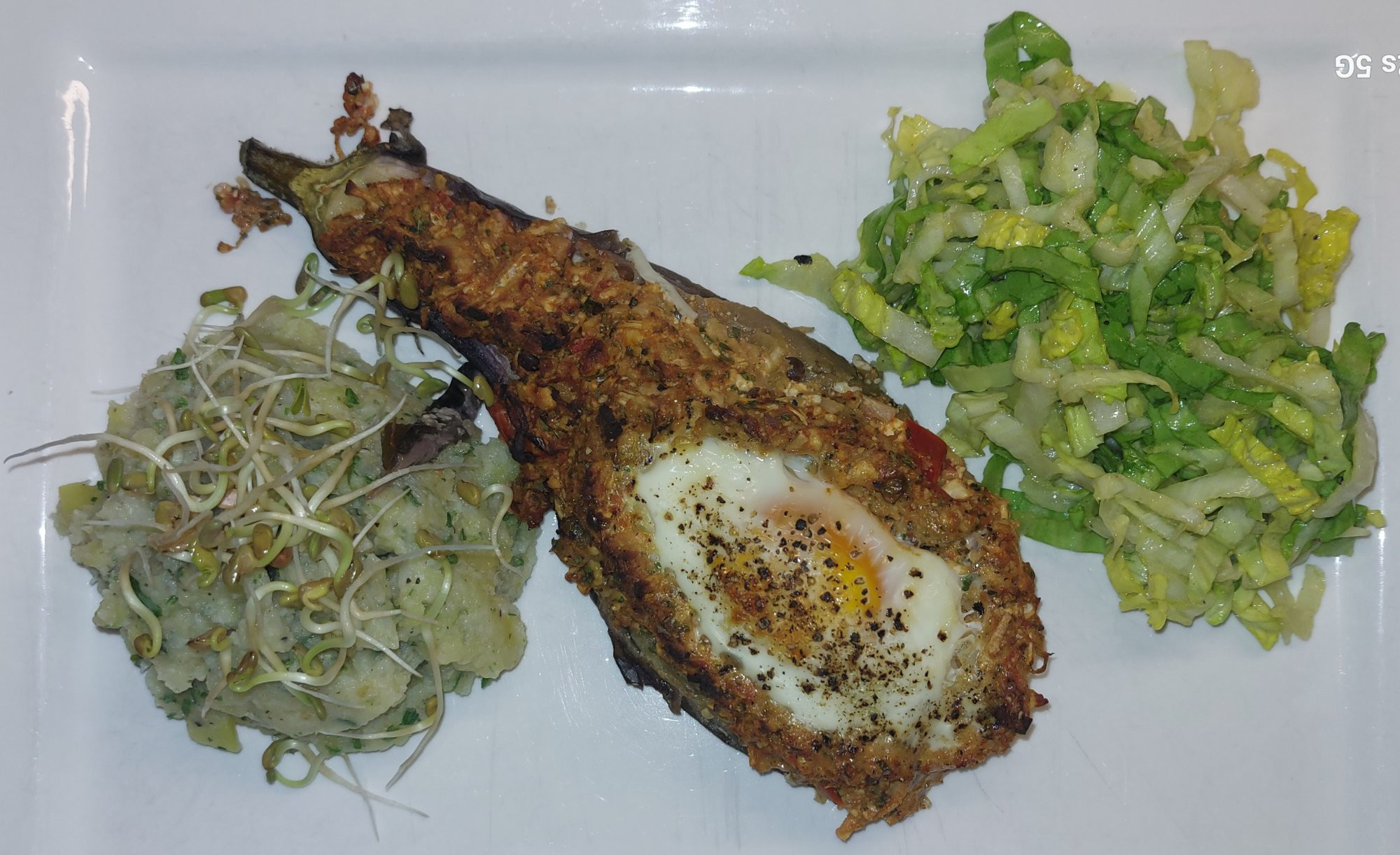 Heute gab's gefüllte Aubergine mit Kartoffel-Blumenkohl-Stampf und Endiviensalat