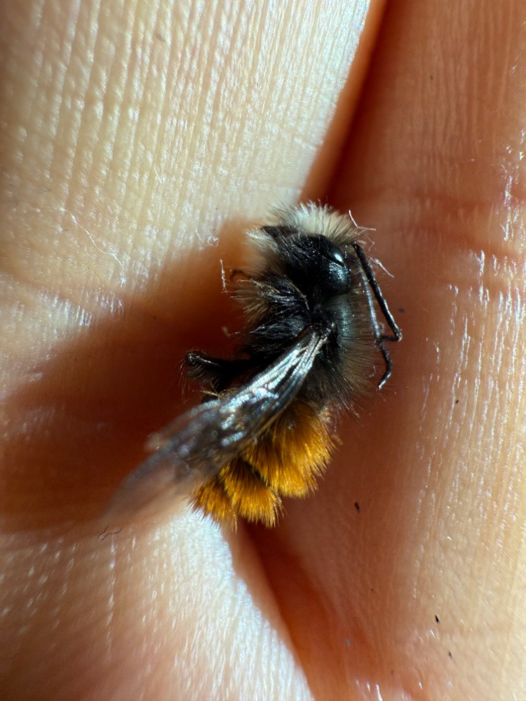 Jedenfalls ist diese Mauer Biene schon unterwegs gewesen vllt etwas zu früh, denn lebendig sieht sie nicht mehr aus und bei soviel Behaarung hatte sie wohl kein langes leben als erwachsene Biene, schade