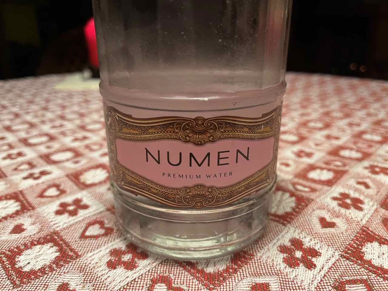 King-Garnelen in Butter-Knoblauchsoße mit Penne rigate und Kirschtomaten gebraten wieder zum "Numen"-Wasser aus Spanien .