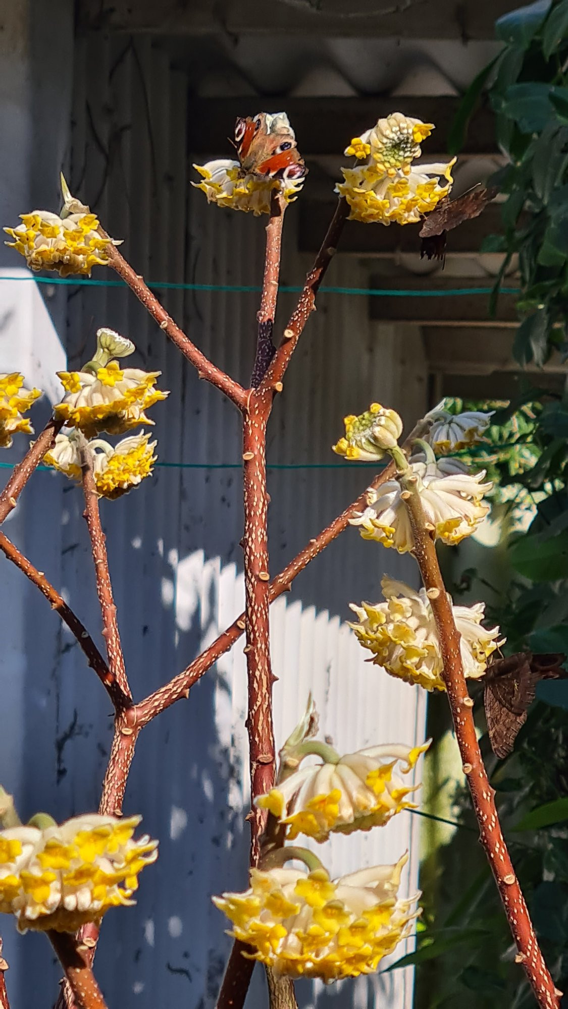 Scheint ökologisch ähnlich wie der Seidelbast Daphne Mezereum zu sein vom Blützeitpunkt. Dann noch Duft zum anlocken.An dem konnte ich auch schon oft Schmetterlinge beobachten. Der papierstrauch scheint aber noch etwas tifere Röhren zu haben vllt ist der noch ein Ticken interessanter für Schmetterlinge.