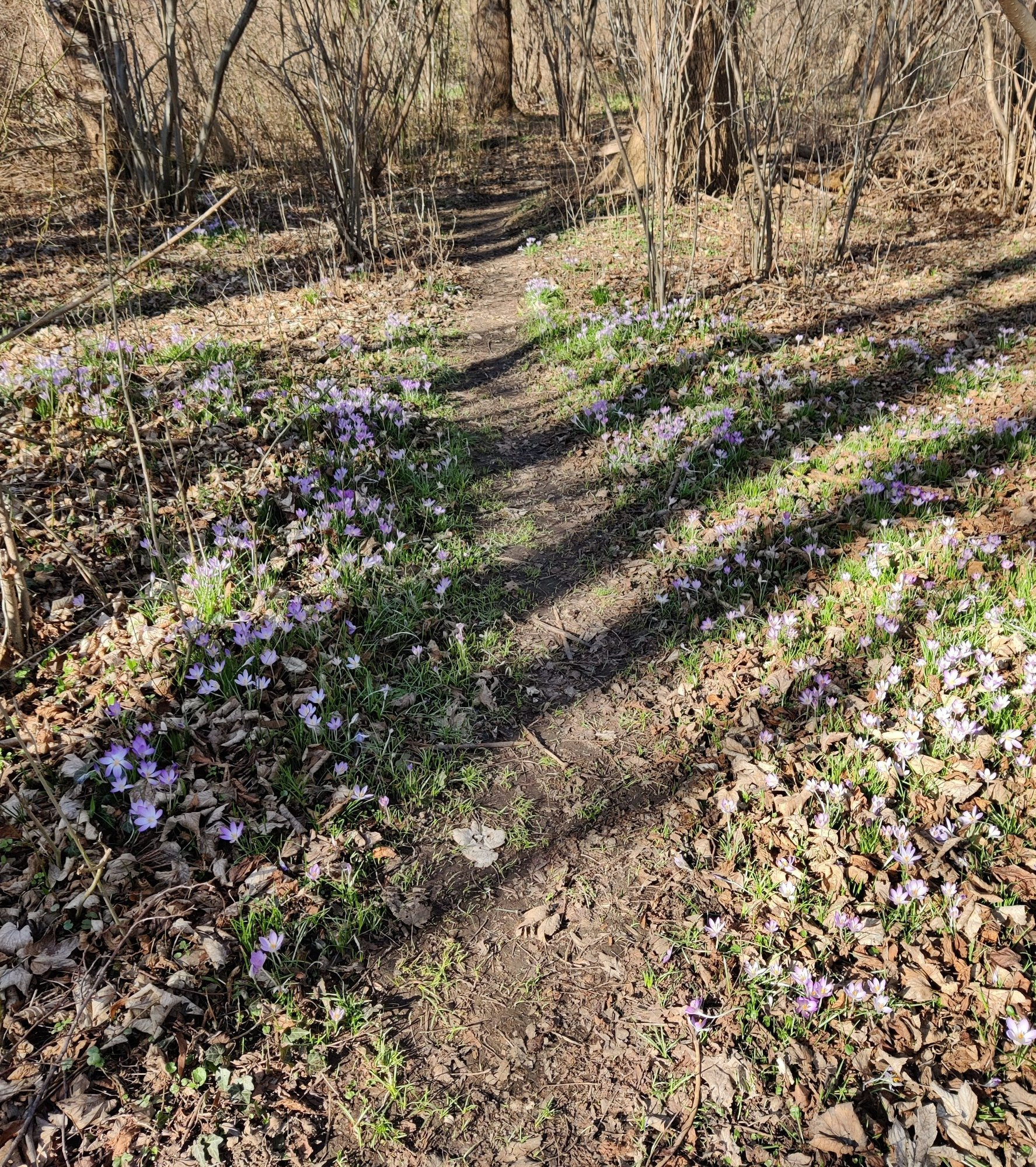 Ein "Krokus-Pfad" im Innern eines Miniwäldchens und eine Gruppe auf der anderen Seite des anliegenden Weges.