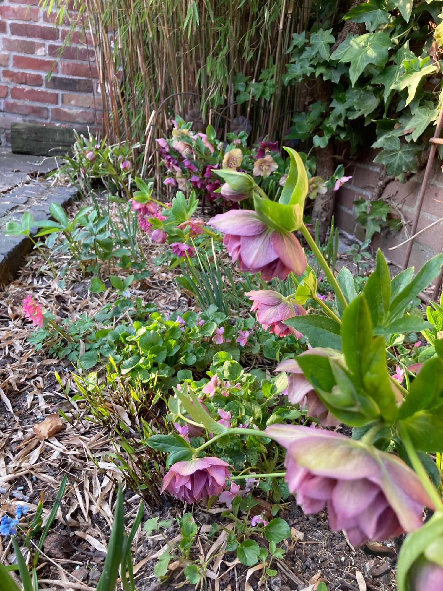 Bei mir gedeihen die Helleborus, in der Einfahrt habe ich grob gezählt, es sind 60-70 blühende Hellis und jede Menge junge Sämlinge. Fotos der gleichen Seite von vorne nach hinten und umgekehrt.