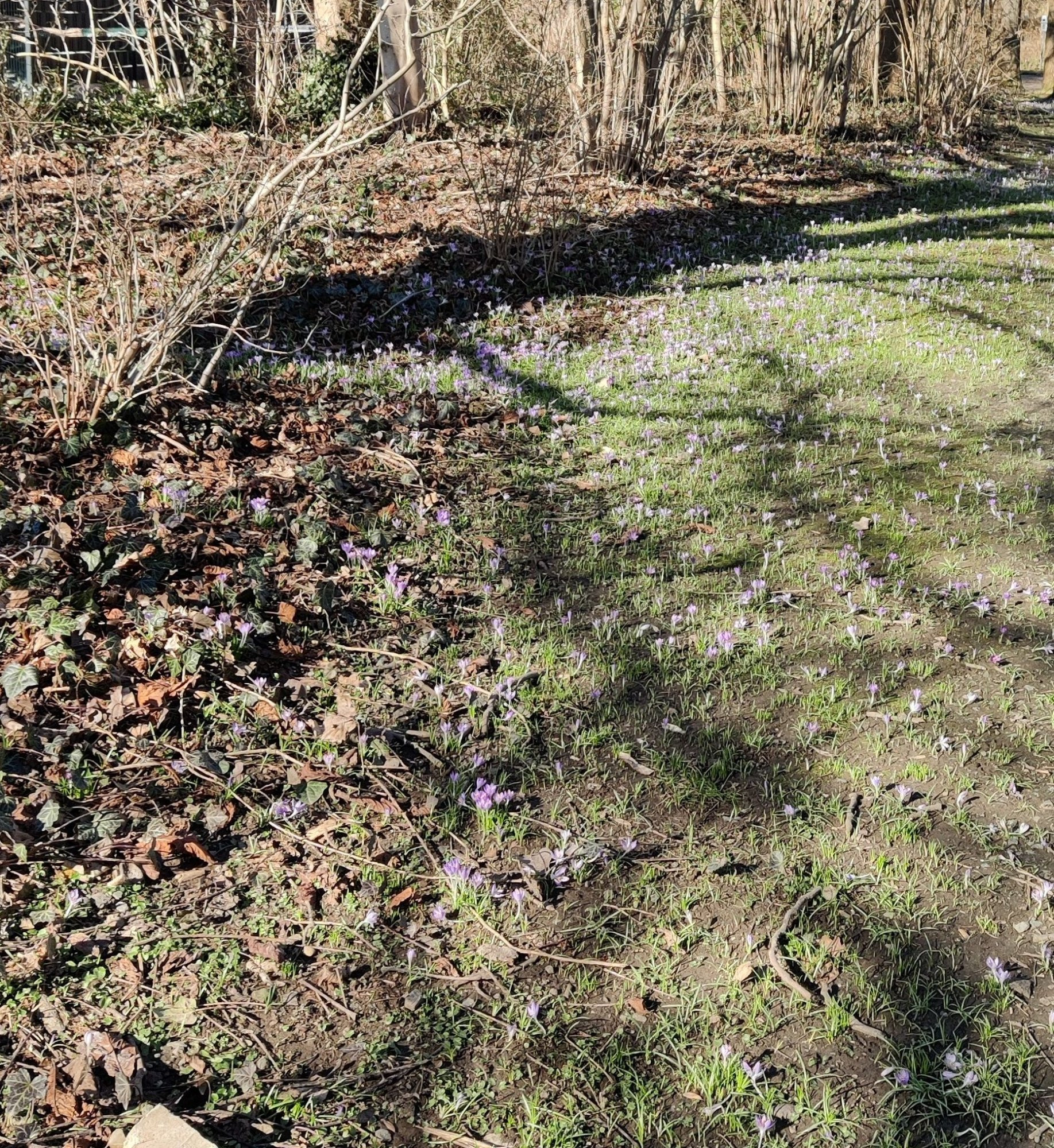 Krokusse verwirren mich. Es gibt hier massenweise Tommasinianus... in den verschiedensten Lilatönen mit mehr oder weniger starkem Blau- oder Rotstich. Ein paar Chrysanthus-Sorten gibt es auch, allerdings sind die weit weniger vermehrungsfreudig... genau genommen, zeigen sie sogar eher eine Tendenz, zu verschwinden. Und mehrfach haben ich schon Sorten gekauft, die sich beim Aufblühen als etwas anderes entpuppten. Ich muss also zugeben, bei vielen meiner Gartenkrokusse weiß ich nicht wirklich präzise , wie ich sie ansprechen soll. Trotzdem herrlich, dass sie da sind. In den vergangenen warmen Tagen sind große Tommasinianus-Gruppen auch schon wieder verblüht.
