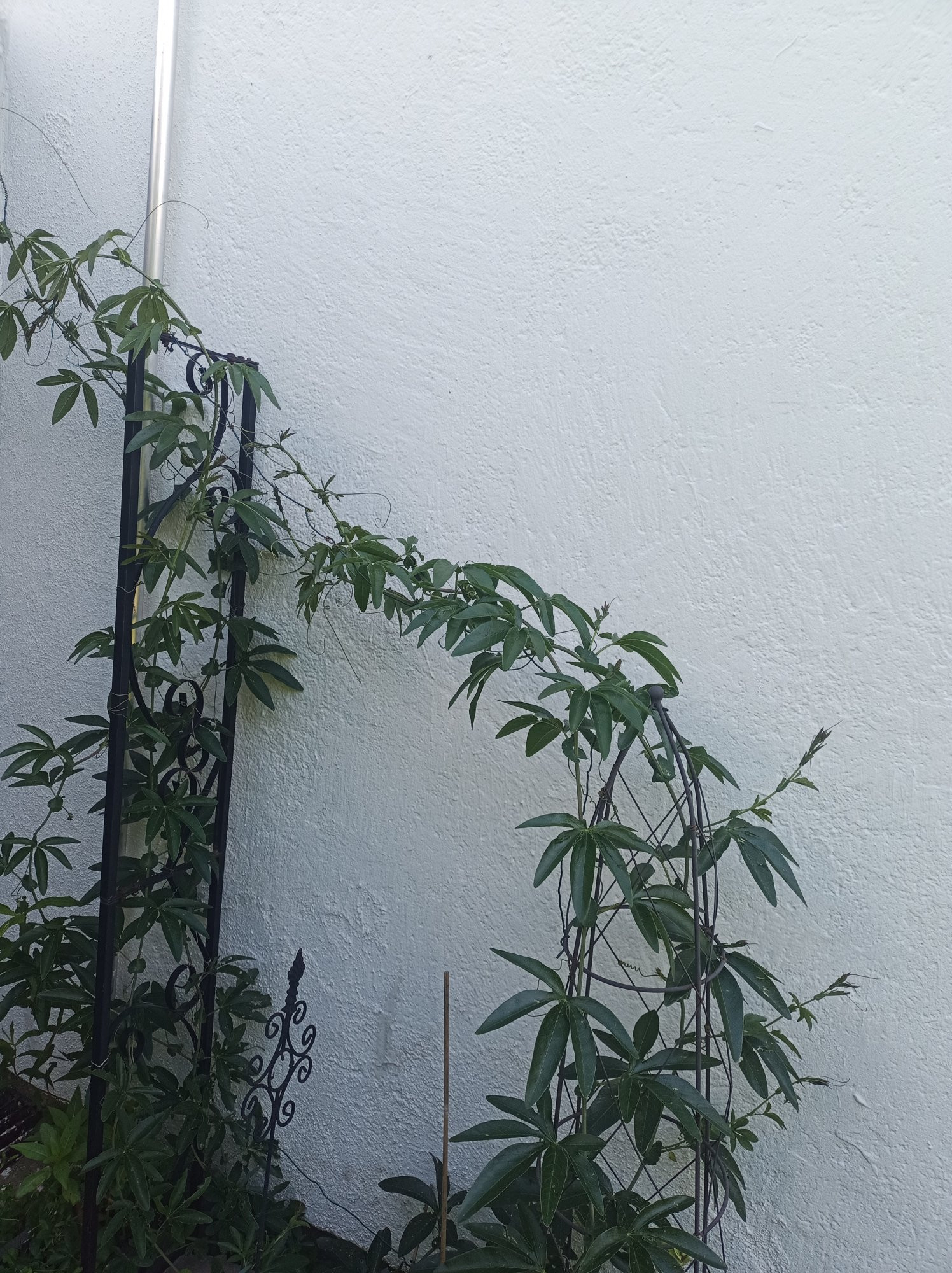 Ihr Standort ist nicht ganz optimal, auf der Westseite hinter dem Haus. Mit mehr Sonne wäre sie wahrscheinlich schon über die halbe Garage geklettert. Für ein paar Euro gab's im Gartenmarkt eine zweite Caerulea, die habe mitgenommen, wird aber nächstes Jahr erst ausgepflanzt. Offenbar kam es bereits zur Befruchtung, die Passiflora im Topf hat eine Frucht angesetzt.