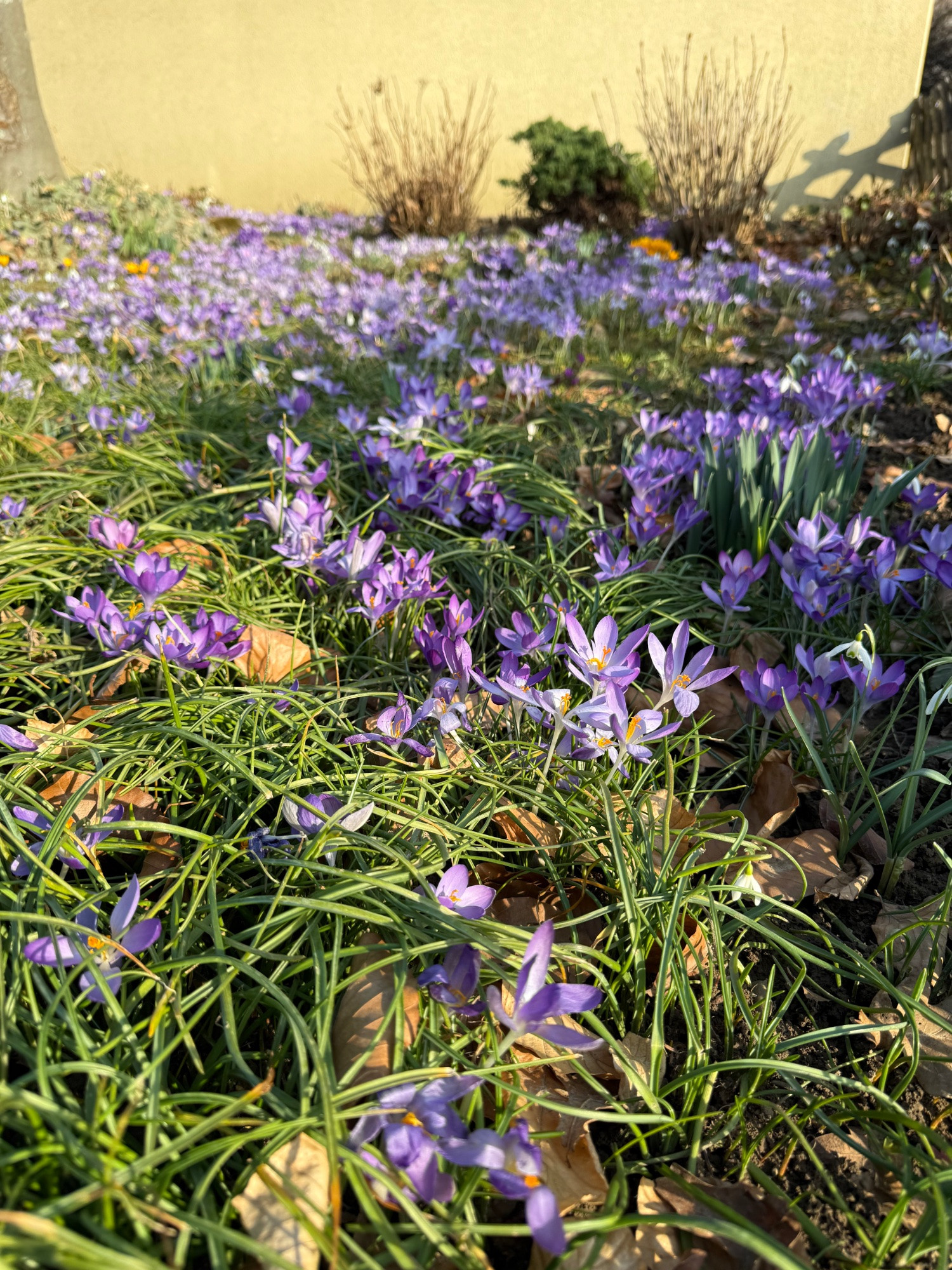 Crocus vernus in weiß, lila und Mischfarben scheint ähnliche Ansprüche zu haben wie die Elfen und löst diese hier ab. Sie säen sich auch aus, aber eher verhalten.