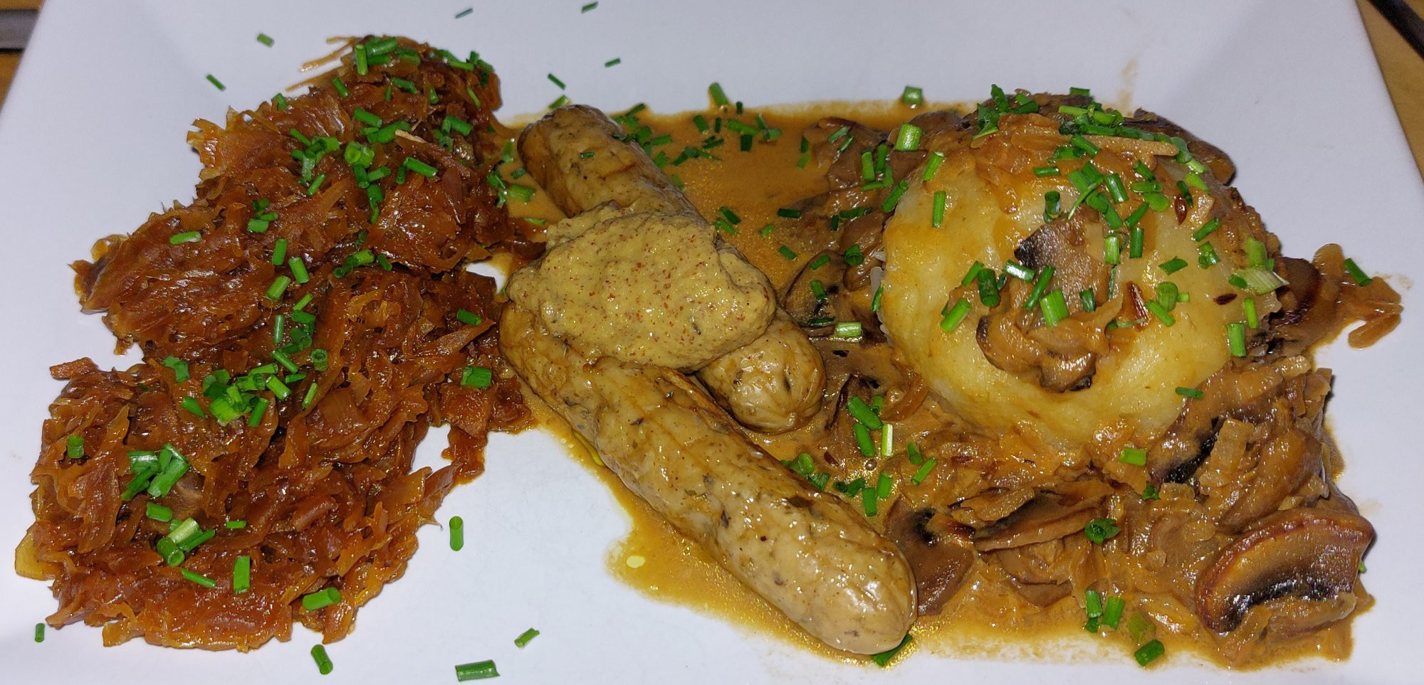 Gefüllte Paprika mit Reis, Tomaten, Zwiebeln und Petersilie, in Gemüsebrühe mit Tomatenmark und Olivenöl eine Stunde auf sanfter Flamme gekocht - eine leichte Variation eines syrischen Rezepts, sowie braune Champignons spanisch mit Schalotten und Koblauch gebraten und mit hellem Balsamico abgelöscht