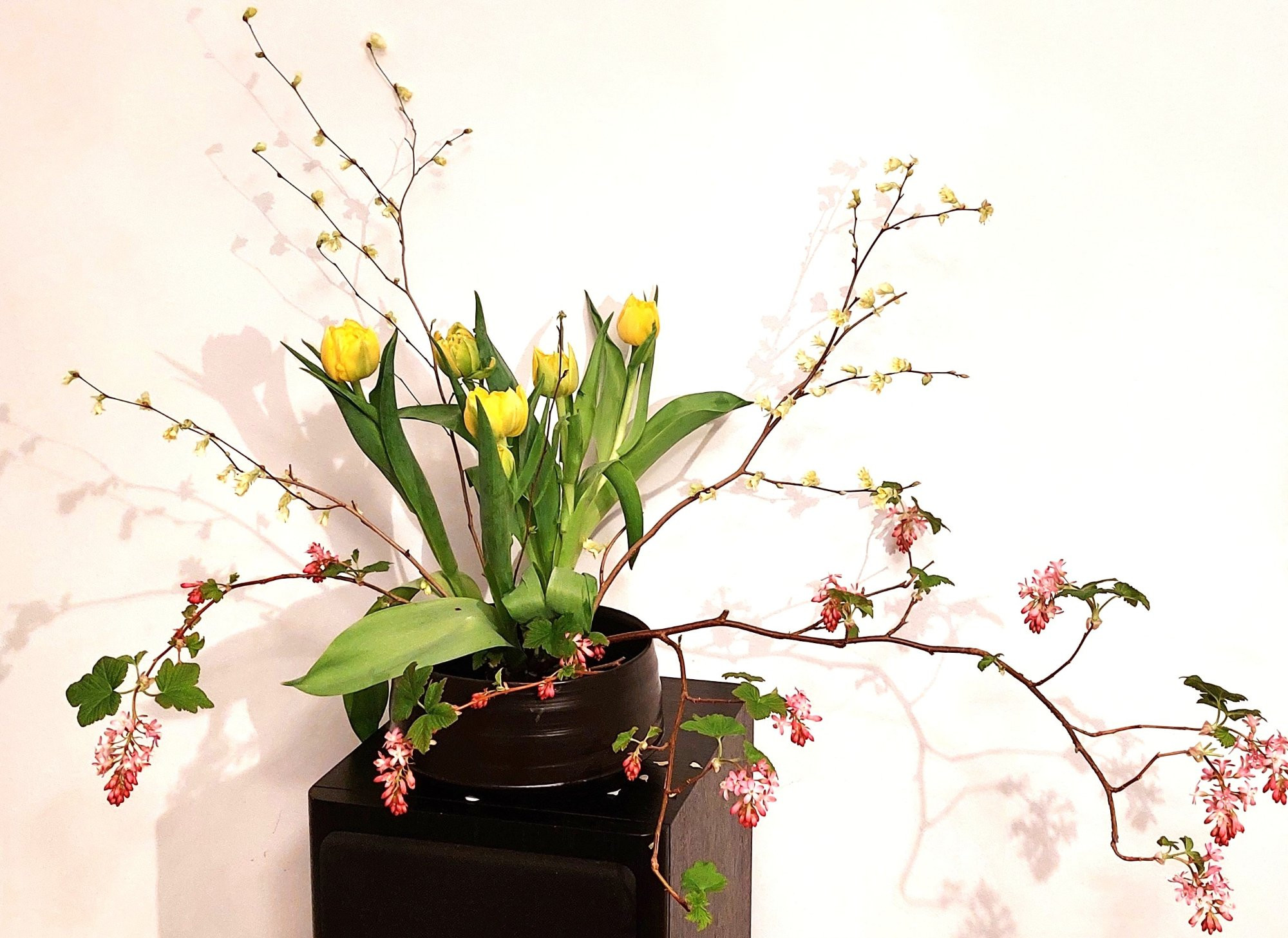 ...und nochmal Tulpen: wenige, gleicher Behälter und Standort, mit ein bisschen Blutjohannisbeere und wenigen Corylopsisspitzen. Wie ich schon mal schrieb: Tulpen haben Charakter, da reichen wenige; ein "Bund" Tulpen ist nicht mein`s. Das dienende "Beiwerk" setzt nur Akzente und erweitert den Raum.