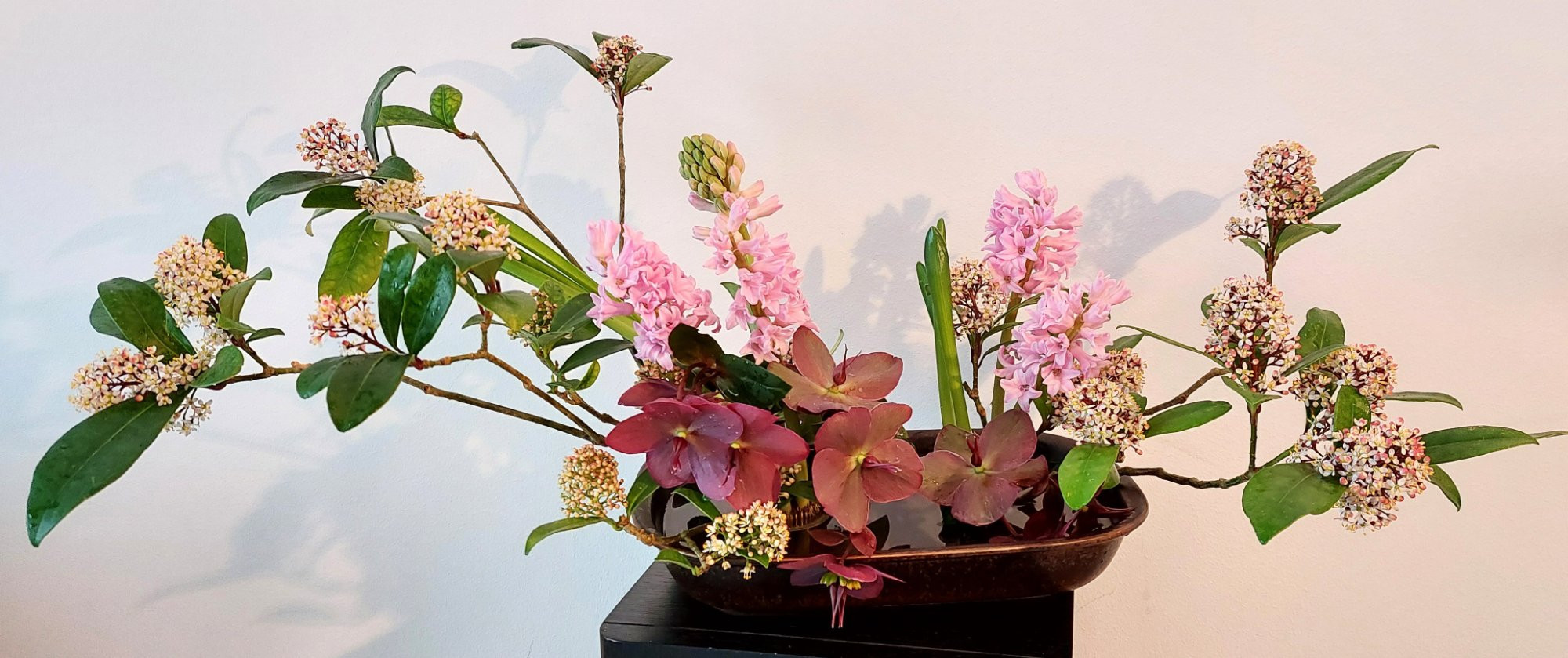 Hyazinthen und Skimmien, dazu ein nahezu verblühter Helleborusblütentrieb (hält in diesem Zustand recht lange): Frühling